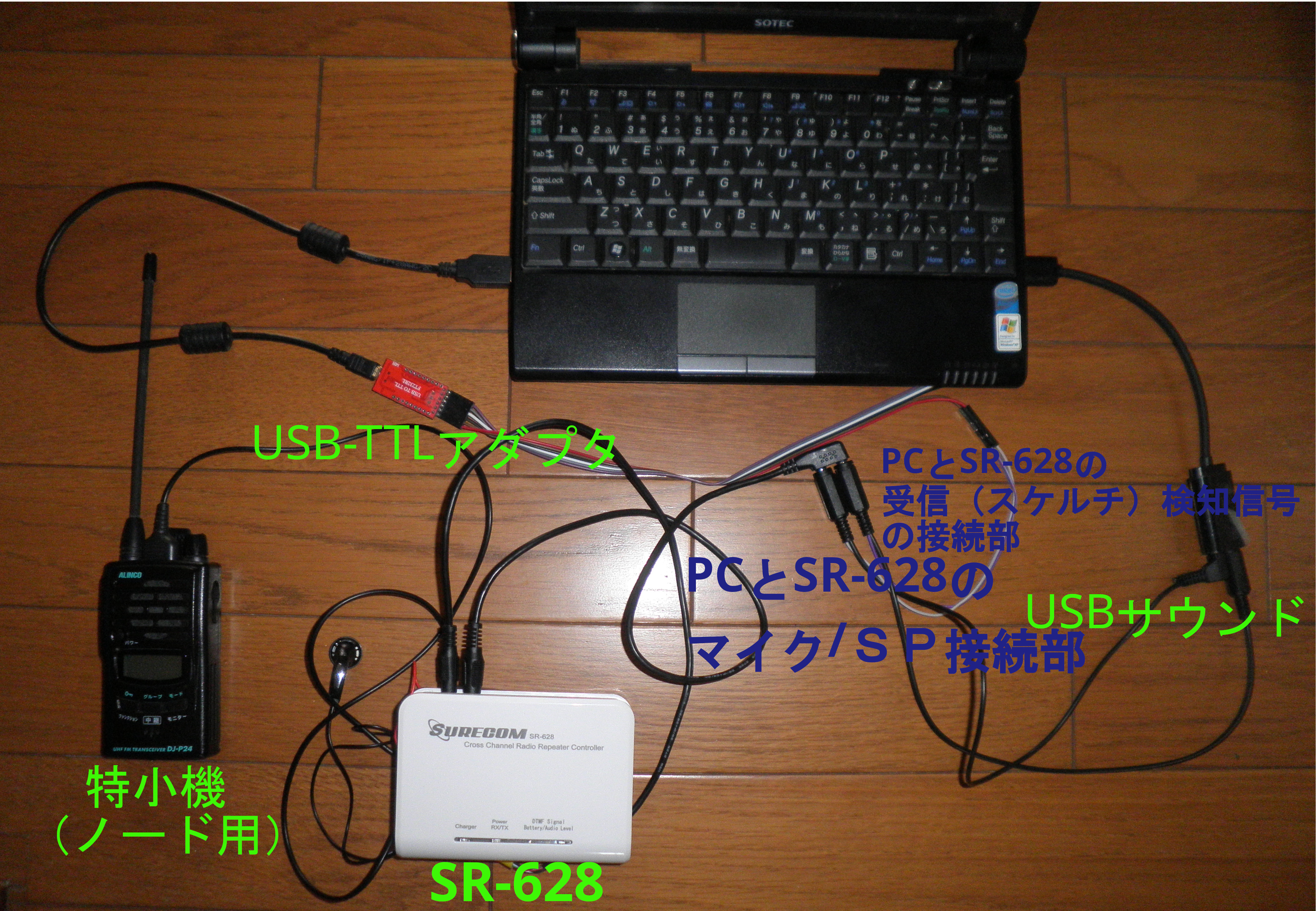 SR-628は、本来はトランシーバーを2台接続してクロスバンドレピーターを構築するためのインターフェイスのようです。FRNCでは、トランシーバーはノード用1台のみ接続して、2台目部分は、USBサウンドのスピーカーとマイク、USB-TTLレベルコンバーター(CTSポート)にそれぞれ結線しています。